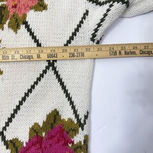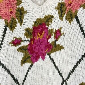 Beautiful vintage Express "CIE Internationale" handknitted sweater featuring a stunning rose floral design on a soft ivory background.