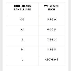 An elegant way to wear your Trollbeads. Use the bangle alone with your favourite Trollbeads or let several bangles decorate your wrist. Try to mix classic and twisted bangles. The expression is stunning. Use spacers at each end of the beads.