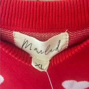 red sweater by Marled. Features white heart accents. Perfect for casual wear. Worn maybe once. No imperfections that I can see. In good condition. Perfect for Valentine’s Day. Size extra large. I believe this might be a junior size extra large. Pictured and selling as is. From a pet friendly household. Non smoking household. No returns, exchanges, or trades. Final sale.
