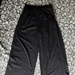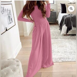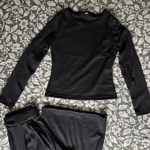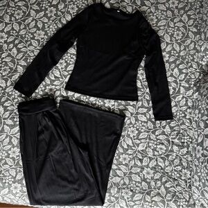 Stylish black ribbed two-piece set featuring a long-sleeve top and matching pants. Perfect for any occasion.