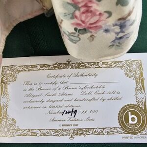Keywords: Brinn's doll, Abigail Smith Adams, First Lady doll, American Tradition, Collectible doll, Limited Edition, Vintage doll, Porcelain doll, Floral gown, Doll with box, 1987 doll, Collectible edition, Historical doll
