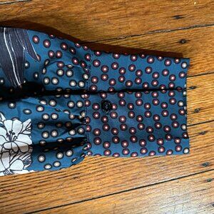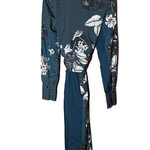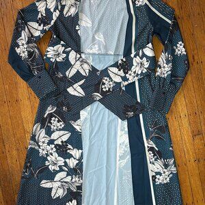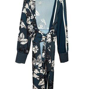 Zara Teal Blue Floral Dotted Patchwork Printed Satin Belted Kimono Robe Size S/M
