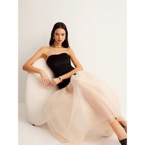Elegant strapless gown featuring a sophisticated black bodice and a flowing tulle overlay. This dress showcases a sleek strapless design that accentuates the shoulders and neckline, creating a striking silhouette. The fitted black bodice contrasts beautifully with the ethereal tulle skirt, adding depth and dimension to the overall look. Its maxi length and lightweight fabric ensure graceful movement, perfect for making a statement. Ideal for cocktail parties, formal events, and elegant evenings out.