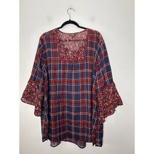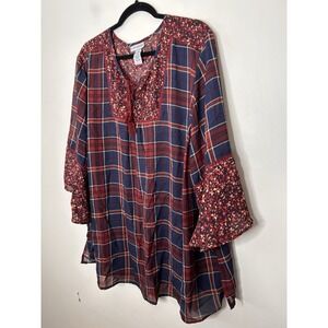 CATHERINES Women's Red Blue Plaid Sheer 3/4 Sleeve Top Blouse Size 2X 22/24