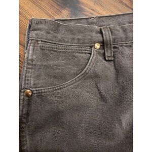 The original back leather patch is missing, which is reflected in the price. Wrangler branding is still present via hardware, rivets, pocket stitching, and interior tags.
