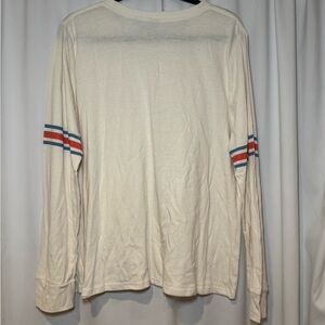 Cream long sleeve shirt with USA print. Features red and blue stripes on sleeves.