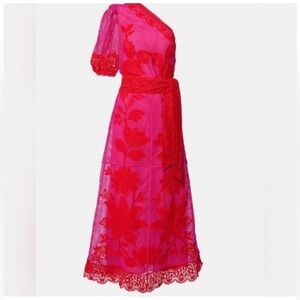 Make a statement with this elegant one shoulder dress, featuring intricate lace details. The bold red color is perfect for any special occasion.