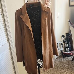 Chic and versatile brown mid-length Faux suede open front coat by Premise. Soft microsuede material, lightweight and designed to resist wrinkling with notch lapels. Suitable for travel and everyday wear.