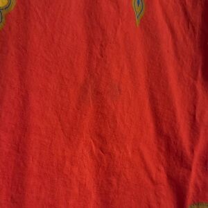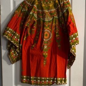 Vibrant vintage bohemian tunic with intricate patterns. Features orange and green colors.