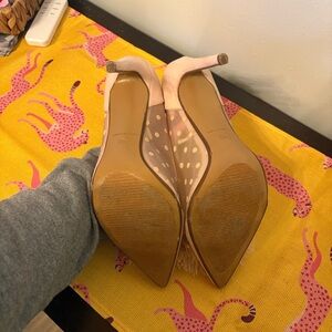 Chic pink heels with mesh polka dots. Fluffy pom-poms add playful charm. Heel measures 4.25”. Mesh polka dot siding. Feather Pom Poms on top of shoe. Super cute and girly. Size 10.
