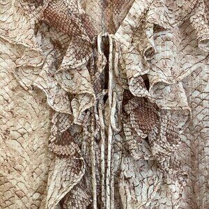 keywords: snakeskin, snake print, animal print, western, boho, bohemian, ruffled, ruffle, ruffles, flouncy, sheer, blouse, shirt, top, long sleeve, romantic, anthropologie, lightweight, versatile, casual, party, v-neck, chiffon