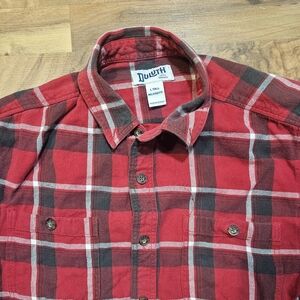 Duluth Trading Co flannel shirt in L Tall relaxed fit. Heavy cotton red plaid workwear style.