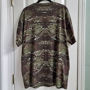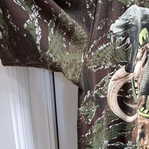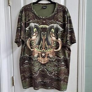 Striking tee with snake and skull motif. Rich brown and olive hues. Eye-catching design.