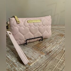 Betsy Johnson Small Clutch W/ Removable Crossbody Strap & Wrist Strap Light Pink. Stitching in heart shapes