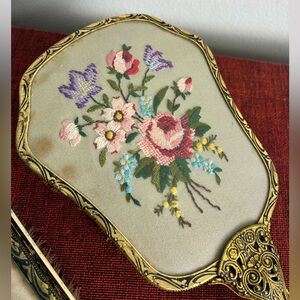 Vintage Delina Vanity Brush Set Needlepoint Floral Hair Brush & Clothing Brush