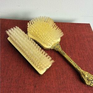 Description: Beautiful vintage Delina vanity brush set featuring classic floral needlepoint and ornate gold-tone detailing. A timeless addition to a dressing table, guest room, or vintage vanity collection. Sets like this evoke old-world charm and make lovely decorative pieces even beyond their original use. Includes: • Hair/vanity brush with decorative handle • Matching clothing/vanity brush Approximate Measurements: • Hair brush: ~10” long • Clothing brush: ~6.5” long Condition: Good vintage condition with visible wear consistent with age. Some discoloration/spotting present on the underside of the clothing brush. Please review photos carefully for full condition detail.