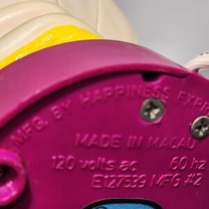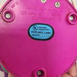 Barney and Friends Childs night lamp. Purple, orange, red, yellow, and green are classic bright colors. Electric 110 volt 5 1/2 ft corded with inline on-off switch. Works great and has a muted orangish glow for a subtle comforting child night light. It is plastic and some noted yellowing from age and use and possibly an old line that was from a crack. The photos indicate the current views and good condition considering the age.