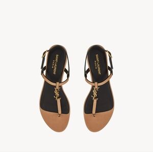 Elegant tan sandals with iconic gold YSL logo. Sleek and stylish design.just worn a couple times , will add updated pics in a bit . Timeless and completely versatile : box and dust bags tags etc . Retail for 925$