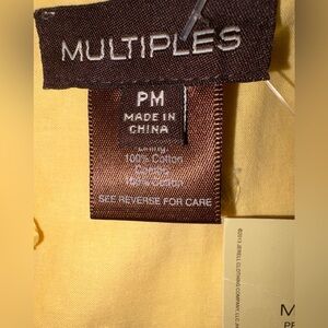 100% cotton, yellow 2 layer top, size Petite Medium. NWT, I see one tiny “dirt” mark on the back, which you can see in the last photo.