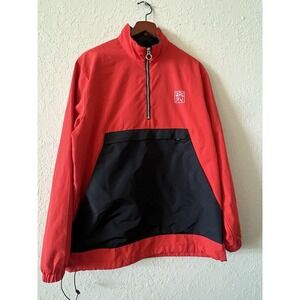 Anime graphic windbreaker jacket in vibrant red and black. Features a striking large graphic on the back showcasing an anime character amidst lotus flowers and water. The front boasts a contrasting black panel across the chest, a quarter-zip neckline, and a discreet embroidered logo on the left chest. This stylish jacket is perfect for casual outings, music festivals, or everyday wear.