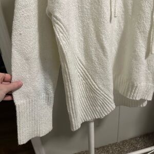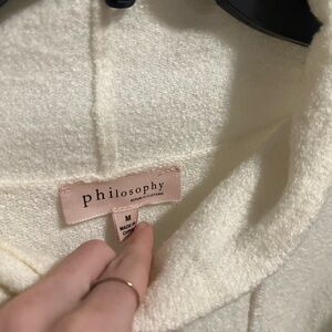 Philosophy white knit funnel neck pullover sweater with a cowl neck and drawstring.