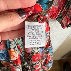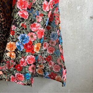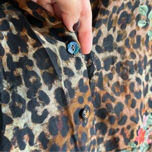 This Johnny Was Cheetah Long Shirt Dress offers a bold bohemian-chic style with its unique mix of cheetah print and vibrant florals. Crafted from a lightweight silk-blend fabric, it features a relaxed silhouette, collared neckline, and a button-down closure. With 3/4 sleeves and a thigh-high side slit, this dress can be worn on its own or as a layering piece over swimwear for a breezy, stylish summer look. Excellent preowned condition, no noticeable flaws.