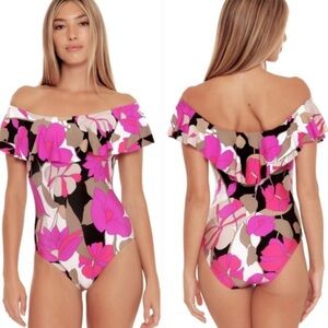 Trina Turk Lynx Gemini Floral Pink Ruffle Off the Shoulder One Piece