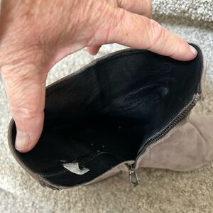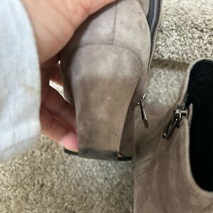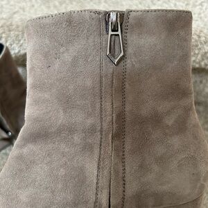Gorgeous booties are a taupe grey color. Very few signs of wear. Perhaps a bit of darkening on one toe. Otherwise in like new condition. Classic suede boot.