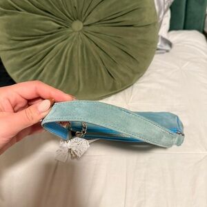 Preowned item in excellent overall condition. Suede exterior and pebble leather trim. One interior zip pocket. Fits a large smart phone.