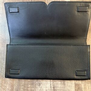 Elegant black clutch with signature Tory Burch design. Sleek and stylish. Clean inside and out, like new condition. Two credit card slots inside and enough room for your mobile phone, and some make up items such as compact and lipstick. Perfect evening bag when you don’t want to carry too much. Comes with dust bag.