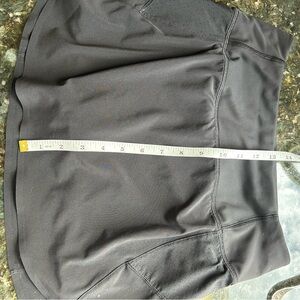 This black running skirt/skort has one small area of pulled stitches in the under shorts area of left leg. See pics. Otherwise in like new condition. No signs of wear. Elastic on shorts is in excellent condition see pics for measurements