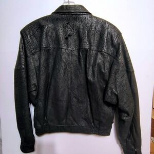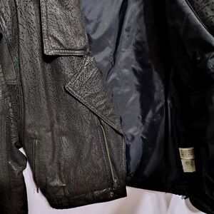 Wilsons Suede & Leather bomber jacket in a textured black finish. Features a unique all-over crackled pattern, a wide collar, asymmetrical zip front closure, and zippered pockets. The interior is lined with a smooth nylon taffeta for comfortable wear. Professional leather clean only.