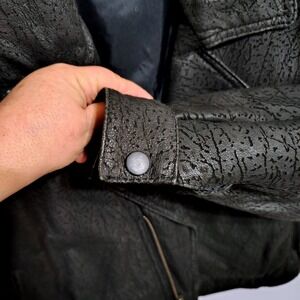 Keywords: Wilsons Leather, bomber jacket, textured leather, vintage jacket, moto jacket, designer leather, womens outerwear, genuine leather, asymmetrical zip, black leather, unique pattern, retro fashion, leather coat