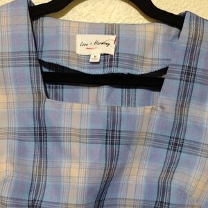 This stylish crop top features a light blue and cream plaid pattern, perfect for a relaxed look. With short sleeves and a square neckline, it offers a comfortable fit that ends above the waistline.