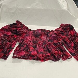 NWT Size Large Elegant red floral blouse. Features long sleeves and ruffle details. Perfect for any occasion.