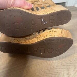 WOMEN'S CHOCOLAT BLU WALDA PLATFORM SANDAL IN SAND LEATHER WEDGE CORK SAND TAN size 7. There is one small flaw. Please see photo 3.