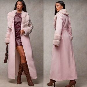 Luxury faux fur trimmed long coat fur jacket fur cuff fur collar vintage pink