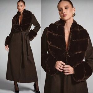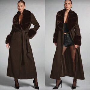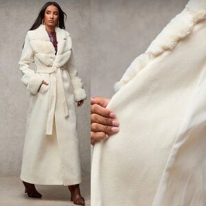 Elegant cream long coat with plush faux fur trim at the collar and cuffs for a timeless vintage inspired look. Designed with a tailored silhouette and full length cut, this coat delivers polished warmth with a luxe finish. The neutral cream tone makes it easy to dress up or down, perfect over dresses, denim, or sleek winter layers. A chic cold weather staple with classic appeal and elevated drama. New with tags. First image for styling ideas only. All others are actual item.