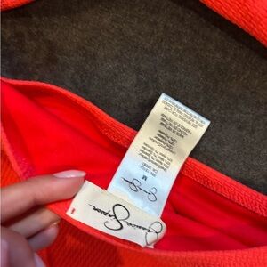 Bold red bikini top with elegant design. Ideal for summer fun.