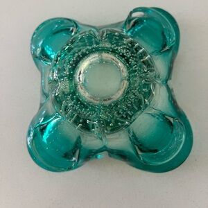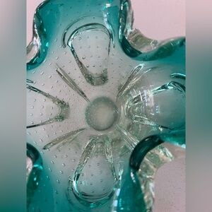 This Murano art glass bowl is beautiful. It’s made of heavy glass and has controlled bubbles inside. It measures 4” x 7.5”. It weighs 2.7 pounds. It’s in very good condition with no chips or scratches.