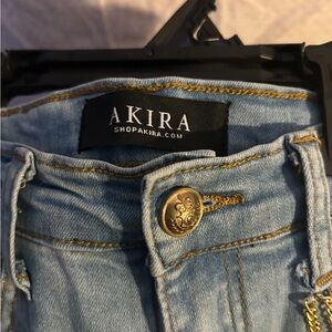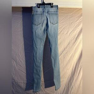 Chic light blue skinny jeans with stylish rips. Perfect for a modern look.