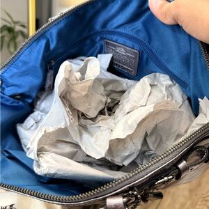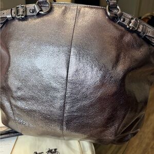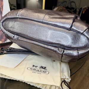 From the 2012 Season of Coach is this brand new, never used Lindsey Satchel in Gunmetal. It measures 13 inches by 13 inches with a base width of 3 inches. The handles have a 6 inch drop. The removable shoulder strap is 34 inches. This bag does not have any protective feet. The metallic finish is still in perfect shape. The interior has slip and zip pockets, and still has all the original stuffing. This bag has the original dust bag and has always been stored in a smoke-free, pet-free area.