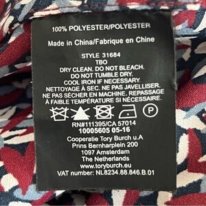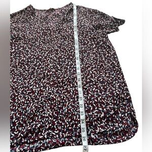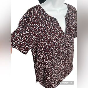 Tory Burch maroon blue white patterned short sleeve v-neck top shirt. Short sleeve. Maroon, blue, light blue, white pattern design. Notched v-neck. Polyester. Lightweight. This top is perfect tucked in trousers. So cute! Women’s size small. See pictures for approximate measurements.