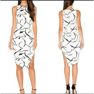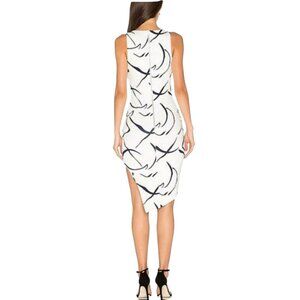 A sleek, modern statement piece, this dress channels contemporary minimalism with a refined, art-driven edge. The clean, high round neckline and body-skimming silhouette reflect moderncore and minimalist aesthetics, emphasizing structure, balance, and intentional simplicity. Abstract patterning introduces a subtle graphic sensibility aligned with artwear and modern elegance, while the asymmetrical hem and sculpted lines bring in architectural fashion and elevated cocktailwear appeal. The fitted cut and exposed back zipper reinforce polished sophistication associated with eveningwear and urban chic, creating a versatile design suited for formal gatherings, upscale events, and refined nightlife settings.