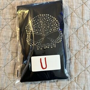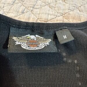 Harley-Davidson women's ribbed tank top in black featuring a rhinestone skull graphic on the front and a rhinestone Harley shield logo at the upper back. Sleeveless fitted silhouette with stretchy ribbed knit fabric, giving strong biker, moto, Y2K, and festival streetwear vibes. Great for layering, riding, concerts, or casual wear. Size women's medium (tagged M). Pre-owned and in good condition with rhinestones appearing intact and no major missing stones noted. Light general wear from normal use. No holes or stains observed. Please see photos for details.