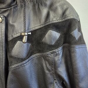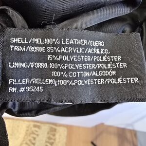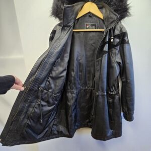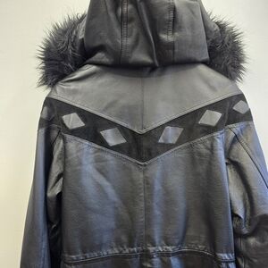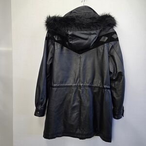 Stylish black leather jacket. Features Faux fur trim and unique detailing. Perfect for a chic bohemian look.