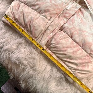 Ethereal and quite beautiful. Keep warm and stay stylish in this oversized, feminine cropped puffer jacket. Some wear as shown in photos on ribbons, and underneath ribbon on right sleeve. Goes unnoticeable while jacket is worn. Light pink and off white Victorian design with birds, floral, etc.