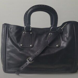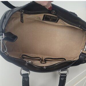 Brand new Prada Nocciolo black soft calf leather tote/ crossbody bag. The bag features silver-tone hardware and stitched details. It has two comfortable top handles and a long, detachable adjustable crossbody strap for versatility. The design includes a signature enameled metal triangle logo on the front. Snap closure, 2 cell phone pockets, one inner zip pocket and large main compartment. Comes with documentation of authenticity.