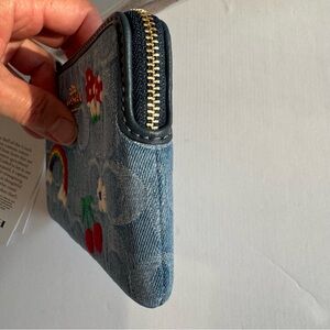 A super-cute, compact Coach Corner Zip Wristlet in Signature denim with whimsical embroidered patches (rainbow, mushrooms, cherries, flowers). Perfect as a mini wallet/coin purse, key pouch, or to toss into a tote.