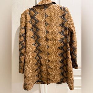 Chico's trench coat with a striking snake print. Features a blend of tan and black. Ideal for a bold fashion statement.